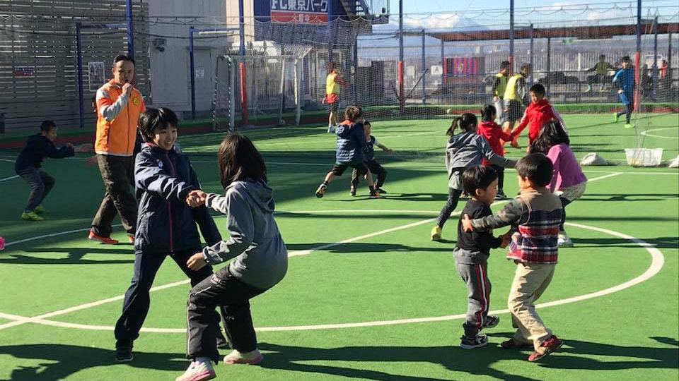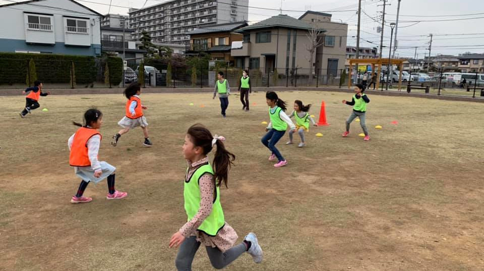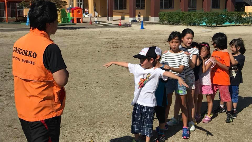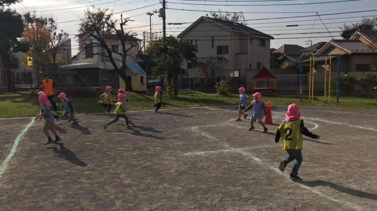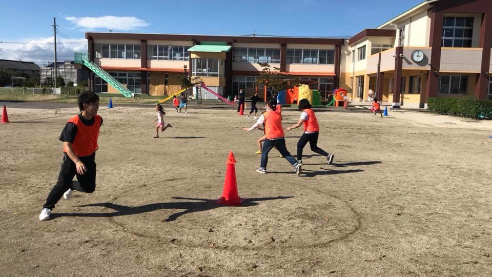 幼稚園でのスポーツ鬼ごっこによるスポーツ指導を行っている模様です。最初は戸惑いながらも、ルールも覚えてチームワークよく取り組んでくれました。